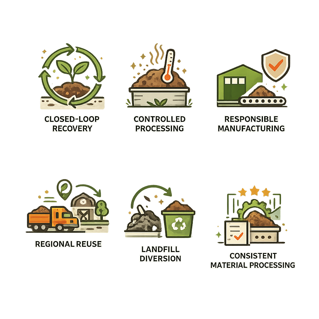 - Closed-Loop Recovery: Organic materials are recovered locally and processed regionally to support circular use of resources.